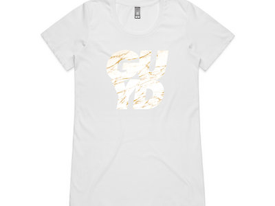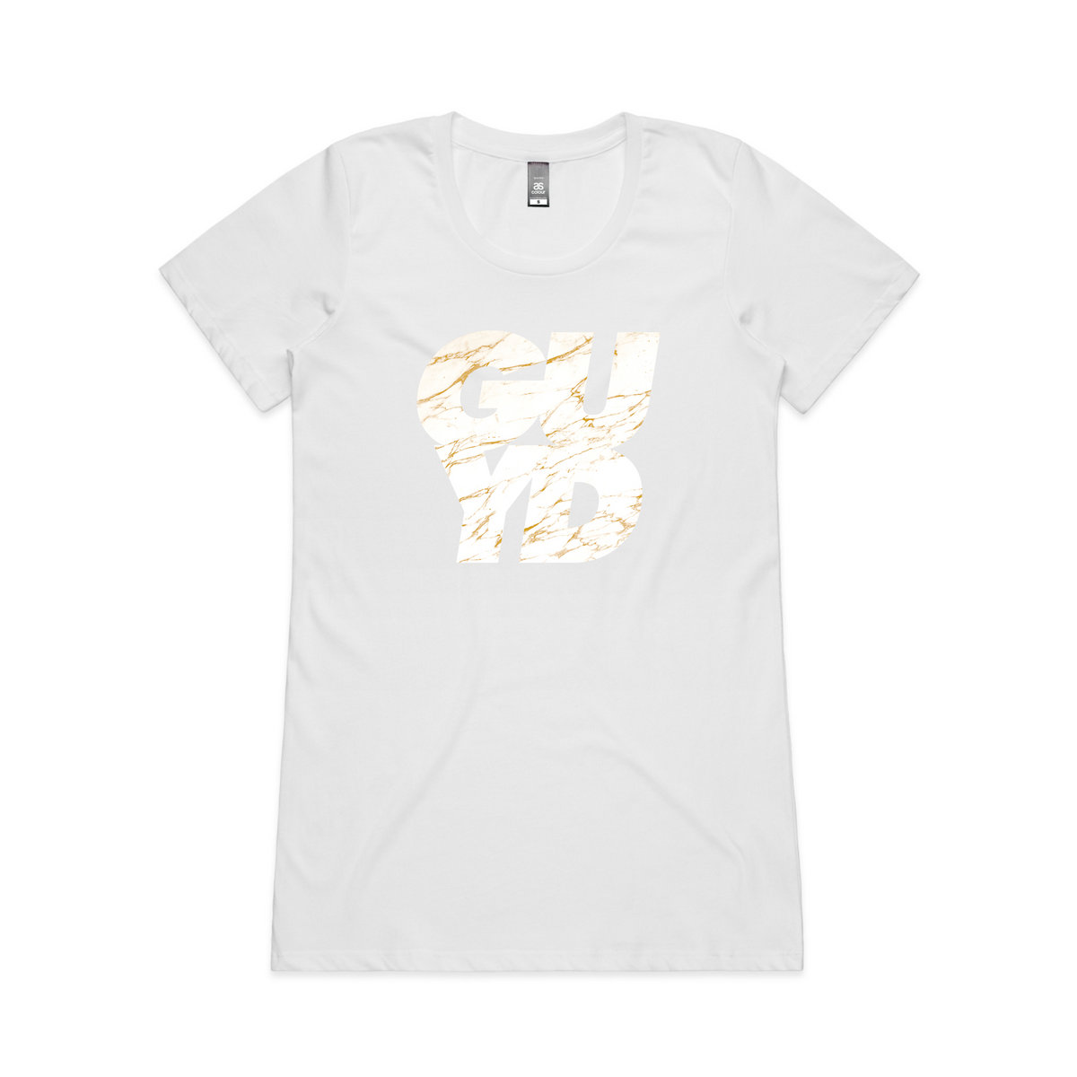 GUYD Logo printed with White and Gold on a White AS Colour Fitted tees.